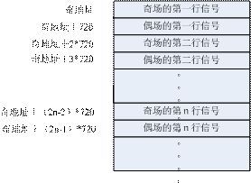 第1種:將一幀的數(shù)據(jù)存儲(chǔ)下來,根據(jù)奇偶場(chǎng)的不同(區(qū)分可以根據(jù)XY),在寫周期的時(shí)候,因?yàn)槠鎴?chǎng)的行之間有偶場(chǎng)的信號(hào),所以寫數(shù)據(jù)的時(shí)候需要跳地址寫,根據(jù)行同步信號(hào)(或者SAV也可以)來區(qū)分行,換行的時(shí)候地址要加額外的720(用來存放夾雜在奇場(chǎng)信號(hào)中的偶場(chǎng)信號(hào)),直到出現(xiàn)偶場(chǎng)信號(hào)(也就是XY=1)地址切換為初始基地址加720,其余的同奇行的處理方法,具體的地址分配表參照?qǐng)D4。