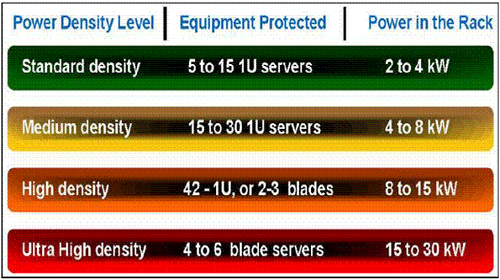 當企業(yè)部署刀片式服務器來宿主其虛擬服務器時尤其如此。刀片式服務器采用多個即插即用型處理裝置,它們共享公共的電氣系統(tǒng)、電源、風扇、電纜和存儲器。這樣的安排節(jié)省了數據中心的占地面積,簡化了硬件管理,并提高了IT靈活性。然而,這同時也大大增加了運算密度。結果,刀片式服務器產生大量的熱,從根本提高了機柜級供電要求。確實,一個典型的傳統(tǒng)服務器機柜可能需要4至6 kW電力,而一個典型的布滿刀片式機架的機柜則可能需要高達30 kW的電力,遠遠超過許多電源和冷卻系統(tǒng)的處理能力。