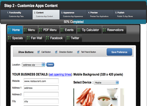Bizness Apps采用可視化操作界面,用戶只需要點擊設置相關選項就能完成應用的開發(fā)工作。因此,Bizness Apps很適合缺少專業(yè)技術人員的小企業(yè)開發(fā)本行業(yè)應用。利用Bizness Apps開發(fā)行業(yè)應用只需五步。首先,開發(fā)者選擇對應的行業(yè)后,需要為應用添加功能組件。第二步,為訂制好的功能組件添加內容。第三步,為應用選定外觀的設計方案。第四步,預覽經過定制后的應用。最后,完成付費后即可發(fā)布你的應用。