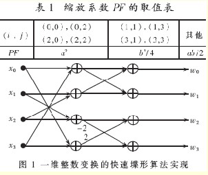 ·2q,PF稱為縮放系數(shù),根據(jù)元素在陣列塊中的不同位置,其取值如表1所示,Qstep為量化步長(zhǎng),由0至51共52個(gè)量化參數(shù)QP決定,QP增加1,Qstep增加12.5%;q=15+QP/6,QP/6取整數(shù);對(duì)于幀內(nèi)宏塊f取2q/3,幀間宏塊f取2q/6。需要指出的是,MF的值可根據(jù)PF和QP的取值經(jīng)簡(jiǎn)單計(jì)算得到,并可形成表格,通過(guò)查表方式便可實(shí)現(xiàn)硬件運(yùn)算,并有效地提高了運(yùn)算速度。