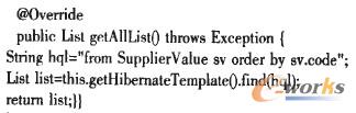 為簡(jiǎn)化業(yè)務(wù)層代碼,使用Spring整合Hibernate的HibernateTemplate封裝Session和HQL的執(zhí)行。業(yè)務(wù)層的簡(jiǎn)化示意代碼如下: