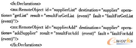 客戶層采用Flex4的Spark UI組件和ActionScript分別實(shí)現(xiàn)MVC模式的View和Control層,實(shí)現(xiàn)與系統(tǒng)用戶的交互,并通過(guò)Spring BalazeDs集成框架發(fā)布的Remote Object,實(shí)現(xiàn)與業(yè)務(wù)層對(duì)象的通訊,進(jìn)而完成CRM業(yè)務(wù)處理。如下代碼為Flex中聲明Remote Object: