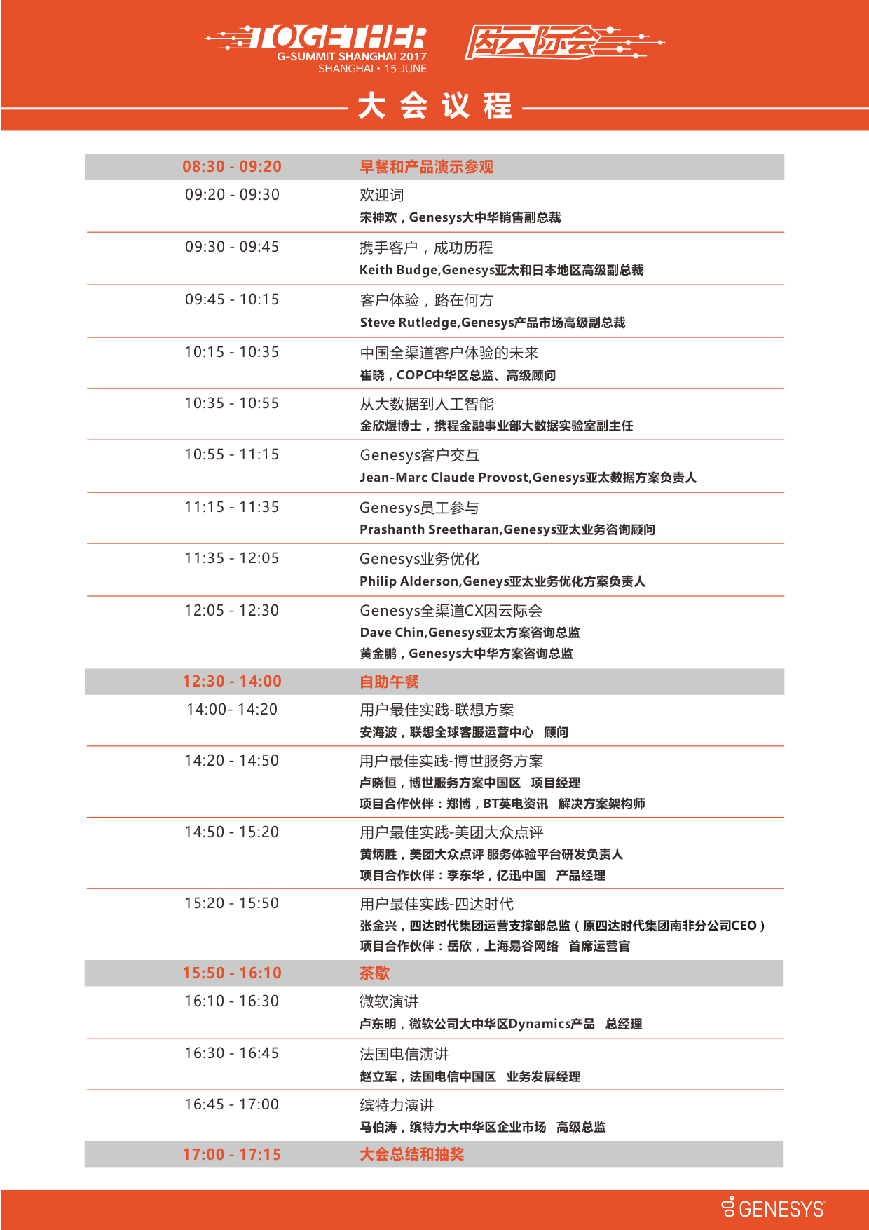 如您有任何意見或是建議,歡迎聯(lián)系我們! 大會聯(lián)系人: 王 艷 電話:+86 13671540832 郵箱:agnes.wang@genesys.com 感謝您的支持!