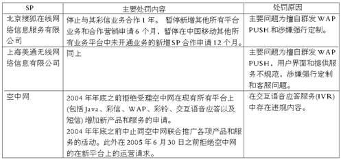 一方面是信息產(chǎn)業(yè)部管理手段的加強,另一方面則是運營商管理方式的嚴肅,從表格中可以看出,中國移動對SP的懲罰已經(jīng)具有相當?shù)牧Χ。在為增殖業(yè)務(wù)打造了相關(guān)的業(yè)務(wù)品牌之后,整個產(chǎn)業(yè)鏈條的控制權(quán)目前還是掌握在運營商手中。