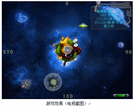 用戶根據(jù)游戲規(guī)則通過固定電話、小靈通和手機(jī)參與《地球保衛(wèi)戰(zhàn)》游戲,就能在短信、語音和電視畫面提示下完成游戲,觀眾通過電視就可以看到火爆的游戲畫面,仿佛如身臨其境;又可以通過參與游戲獲得積分,贏取大獎(jiǎng)。