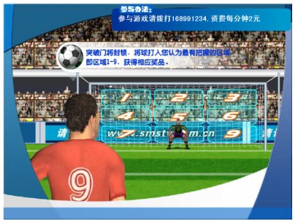 《單挑足球射門(mén)II》是我公司根據(jù)世界杯的一些特點(diǎn)、特色重新開(kāi)發(fā)的一款實(shí)時(shí)游戲。由電視臺(tái)、網(wǎng)站與電信運(yùn)營(yíng)商聯(lián)合經(jīng)營(yíng)的電信增值業(yè)務(wù),由電視臺(tái)提供頻道向電視觀眾播出游戲畫(huà)面(含圖像和聲音),電信運(yùn)營(yíng)商提供電話(huà)線(xiàn)路和短信通道,參與者通過(guò)固定電話(huà)、小靈通和手機(jī)參與游戲,運(yùn)營(yíng)方通過(guò)收取固定電話(huà)、小靈通和手機(jī)的信息費(fèi)實(shí)現(xiàn)盈利。