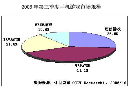 計(jì)世資訊(CCW Research)數(shù)據(jù)顯示,2006年第三季度中國(guó)手機(jī)游戲市場(chǎng)規(guī)模達(dá)到6.7億元人民幣,比第二季度增長(zhǎng)11.9%。 手機(jī)游戲市場(chǎng)規(guī)模包括移動(dòng)運(yùn)營(yíng)商、手機(jī)游戲服務(wù)提供商在手機(jī)游戲業(yè)務(wù)上的總體收入,但不包括手機(jī)游戲軟件開(kāi)發(fā)商的收入。第三季度,短信游戲增速繼續(xù)放緩,短信游戲市場(chǎng)規(guī)模達(dá)到1.8億元,占手機(jī)游戲市場(chǎng)份額的26.5%。WAP,JAVA和BREW游戲繼續(xù)保持快速增長(zhǎng),第三季度WAP、JAVA和BREW游戲市場(chǎng)規(guī)模分別為2.8億元、1.4億元和0.7億元。
