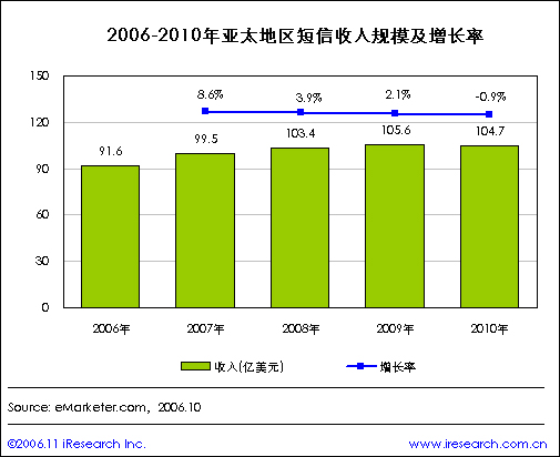 iResearch艾瑞市場(chǎng)咨詢整理eMarketer的相關(guān)數(shù)據(jù)顯示,2006年亞太地區(qū)短信收入將達(dá)到91.6億美元,2007年預(yù)計(jì)短信收入為99.5億美元,比2006年增長(zhǎng)8.6%,2008年短信收入將達(dá)到103.4億美元,比2007年增長(zhǎng)3.9%;2009年的短信收入預(yù)計(jì)為105.6億美元。預(yù)計(jì)到2010年亞太地區(qū)短信收入將達(dá)到104.9億美元,比2009年增長(zhǎng)2.1%.