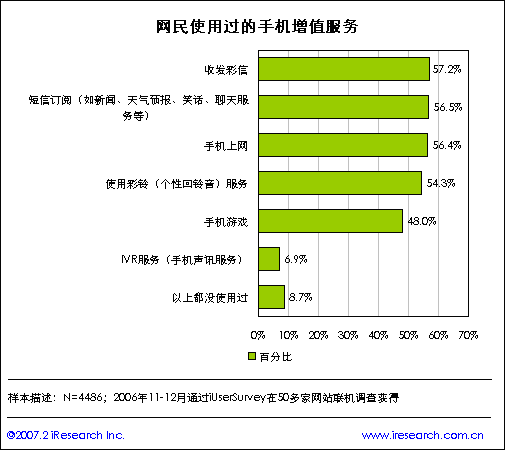 中國移動(dòng)的增值業(yè)務(wù)已經(jīng)發(fā)展到一個(gè)相對成熟的階段,增值業(yè)務(wù)對整體業(yè)務(wù)的貢獻(xiàn)度有望進(jìn)一步提高,2006年中國移動(dòng)增值收入比例達(dá)到23.5%。中國移動(dòng)的增值業(yè)務(wù)收入構(gòu)成目前還比較單一,短信占主導(dǎo)。WAP/MMS/Java等2.5G業(yè)務(wù)將從2007年開始進(jìn)入高速發(fā)展階段,而CRBT和IVR則將逐漸進(jìn)入成熟期與調(diào)整期,增長速度趨緩。iResearch艾瑞市場咨詢通過對用戶研究發(fā)現(xiàn),彩信、短信、WAP、彩鈴及手機(jī)游戲最受用戶青睞,彩信、短信訂閱、手機(jī)上網(wǎng)、彩鈴及手機(jī)游戲是用戶使用最多的移動(dòng)增值業(yè)務(wù)。