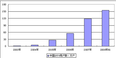 2008年7月,中國最大的ICT咨詢研究機構(gòu)—賽迪顧問股份有限公司(CCID Consulting,股票代碼:HK8235)發(fā)布的數(shù)據(jù)顯示:2008年上半年中國IPTV用戶數(shù)已達到154.5萬,尤其是中國電信方面,隨著推廣力度的不斷增加,用戶數(shù)量增長迅猛。