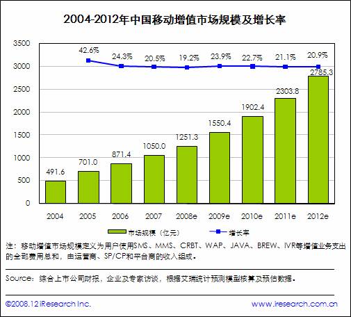 根據(jù)iResearch艾瑞咨詢即將推出的《2008-2009年中國移動互聯(lián)網(wǎng)行業(yè)發(fā)展報告》統(tǒng)計,2008年中國移動增值市場規(guī)模達1251.3億人民幣(約合183.2億美元),相比2007年的1050億人民幣年同比僅增長19.2%,相比2007年增速放緩。(中國移動增值市場規(guī)模定義為用戶為各項移動增值業(yè)務付費總和)