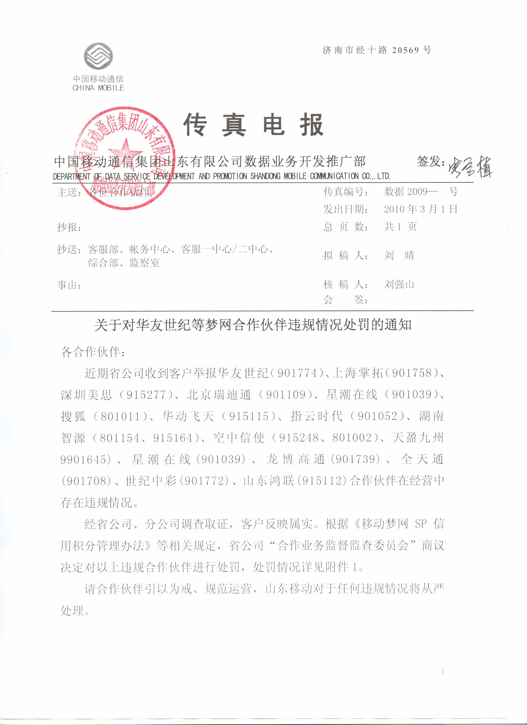 | 15 | 世紀(jì)中彩 | 901772 | 10666873 | 該公司“3D趣味謎語”業(yè)務(wù),使用漢字標(biāo)價(jià),且資費(fèi)提示不明顯。 | 暫停該公司“3D趣味謎語”業(yè)務(wù)(業(yè)務(wù)代碼:CPSDQWMY )在山東地區(qū)的服務(wù)1個(gè)月?鄢庞梅e分8分。 |