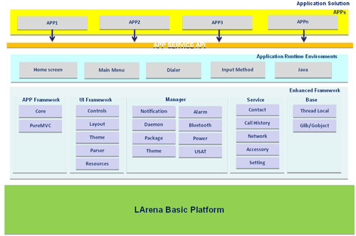 LARENA3.0是聯(lián)芯科技自主研發(fā)的高度可配置、可擴展、開放性的業(yè)內(nèi)主流手機應(yīng)用平臺,它集通信、多媒體和移動互聯(lián)網(wǎng)功能于一體,實現(xiàn)了完整的應(yīng)用生命周期管理和動態(tài)加載能力,充分體現(xiàn)了TD-SCDMA特有創(chuàng)新技術(shù),并支持多種業(yè)務(wù)能力,提供豐富的工具套件。