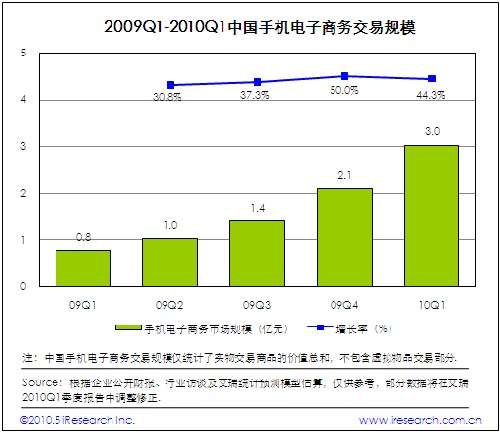 2010Q1中國(guó)移動(dòng)互聯(lián)網(wǎng)市場(chǎng)整體交易規(guī)模達(dá)到44.9億,環(huán)比增長(zhǎng)5.2%.盡管電信運(yùn)營(yíng)商調(diào)整合作伙伴計(jì)費(fèi)政策對(duì)移動(dòng)增值市場(chǎng)發(fā)展產(chǎn)生巨大沖擊,但是移動(dòng)電子商務(wù)、手機(jī)搜索、手機(jī)廣告等行業(yè)領(lǐng)域市場(chǎng)規(guī)?焖僭鲩L(zhǎng),降低移動(dòng)增值市場(chǎng)規(guī)模增速大幅放緩的負(fù)面影響,促使本季度移動(dòng)互聯(lián)網(wǎng)市場(chǎng)規(guī)模繼續(xù)保持增長(zhǎng)態(tài)勢(shì)。在細(xì)分行業(yè)領(lǐng)域中,手機(jī)電子商務(wù)市場(chǎng)表現(xiàn)良好,對(duì)拉動(dòng)移動(dòng)互聯(lián)網(wǎng)整體市場(chǎng)規(guī)模增長(zhǎng)發(fā)揮重要作用。