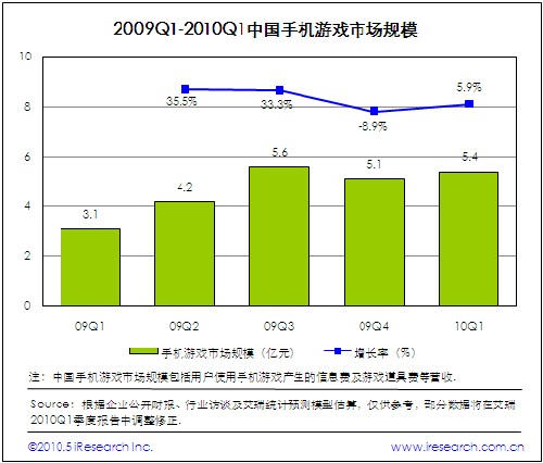 2010Q1中國(guó)手機(jī)游戲市場(chǎng)規(guī)模為5.4億,環(huán)比增長(zhǎng)5.9%.2009年底電信運(yùn)營(yíng)商調(diào)整業(yè)務(wù)合作伙伴計(jì)費(fèi)政策,導(dǎo)致WAP和G+手機(jī)游戲平臺(tái)等特定計(jì)費(fèi)平臺(tái)暫時(shí)停止計(jì)費(fèi),對(duì)手機(jī)游戲市場(chǎng)營(yíng)收增長(zhǎng)產(chǎn)生不利影響。除了季節(jié)因素以外,手機(jī)單機(jī)游戲受電信運(yùn)營(yíng)商暫停WAP計(jì)費(fèi)影響較大,手機(jī)網(wǎng)游受政策影響有限。盡管本季度手機(jī)游戲市場(chǎng)扭轉(zhuǎn)營(yíng)收規(guī)模下滑的不利局面,重新恢復(fù)增長(zhǎng)態(tài)勢(shì),但是手機(jī)游戲?qū)﹄娦胚\(yùn)營(yíng)商計(jì)費(fèi)通道的高依存度,決定行業(yè)受政策風(fēng)險(xiǎn)的影響較大。實(shí)現(xiàn)營(yíng)收多元化是手機(jī)游戲業(yè)界思考和關(guān)注的問(wèn)題。