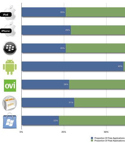 Windows市場中的免費(fèi)應(yīng)用程序比例最少,僅占其應(yīng)用程序總量的22%;其次為蘋果iPad應(yīng)用程序商店,其免費(fèi)應(yīng)用程序比例為26%。iPhone應(yīng)用程序商店中,免費(fèi)應(yīng)用程序的比例為29%。在付費(fèi)應(yīng)用程序方面,Android市場及Palm公司應(yīng)用程序商店中前100名熱銷應(yīng)用程序價(jià)格平均值高于所有收費(fèi)應(yīng)用程序價(jià)格均值。