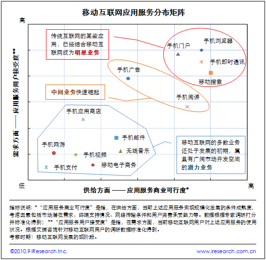 根據(jù)艾瑞咨詢近期發(fā)布的《2009-2010年中國移動互聯(lián)網(wǎng)行業(yè)發(fā)展報告》,移動互聯(lián)網(wǎng)各應(yīng)用服務(wù)在“應(yīng)用服務(wù)商業(yè)可行度”和“應(yīng)用服務(wù)用戶接受度”兩個維度上被劃分為“明星業(yè)務(wù)”、“中間業(yè)務(wù)”和“潛力業(yè)務(wù)”三個類型。具備一定規(guī);l(fā)展市場條件,但還面臨若干限制因素的移動互聯(lián)網(wǎng)業(yè)務(wù),將在未來逐步打開市場。