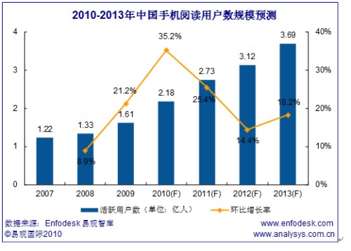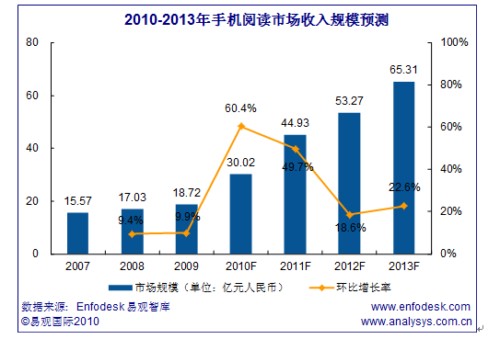 易觀國際(Analysys International)分析預(yù)計(jì)2010年手機(jī)閱讀市場(chǎng)規(guī)模將突破30億元。