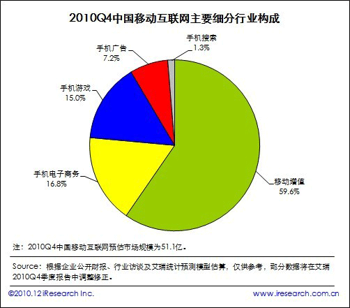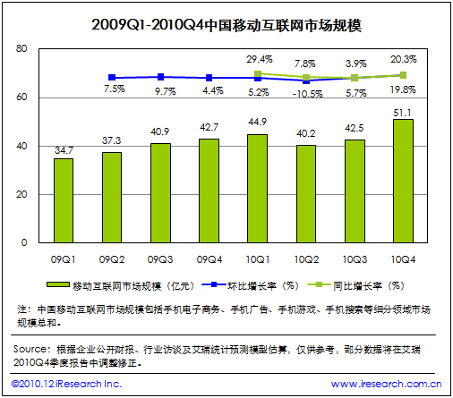 根據(jù)艾瑞咨詢即將發(fā)布的2010年第四季度中國移動互聯(lián)網(wǎng)市場監(jiān)測數(shù)據(jù)顯示,2010Q4中國移動互聯(lián)網(wǎng)市場整體規(guī)模達到51.1億,同比增長19.8%,環(huán)比增長20.3%。艾瑞咨詢分析認(rèn)為,本季度電信運營商對計費通道治理開始收尾,移動增值市場整體復(fù)蘇。同時手機電子商務(wù)、手機游戲業(yè)務(wù)領(lǐng)域取得良好市場表現(xiàn),受手機應(yīng)用商店、位置簽到服務(wù)等新型手機業(yè)務(wù)創(chuàng)新的帶動,移動互聯(lián)網(wǎng)規(guī)?傮w攀升,投融資比重增加。