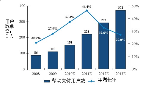 基于“中國(guó)計(jì)算機(jī)世界”的研究預(yù)測(cè),中國(guó)移動(dòng)支付用戶在2009年底達(dá)到1.1億,預(yù)計(jì)將在2013年超過3倍。由于需求大幅提高,電信運(yùn)營(yíng)商會(huì)繼續(xù)在每個(gè)省推出移動(dòng)支付解決方案網(wǎng)絡(luò)。反過來(lái),也會(huì)刺激第三方平臺(tái)和供應(yīng)商的發(fā)展。