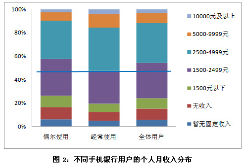 通過對不同手機(jī)銀行用戶的個人月收入分布可以看出,經(jīng)常使用手機(jī)銀行業(yè)務(wù)的用戶的個人月收入偏高,其中,個人月收入5000元以上的比例為15.4%,2500元以上的比例為52.2%,均高于偶爾使用手機(jī)銀行業(yè)務(wù)的用戶。事實(shí)上,經(jīng)常使用手機(jī)銀行業(yè)務(wù)的用戶由于收入偏高且手機(jī)銀行使用頻率高,必然成為手機(jī)銀行業(yè)務(wù)的核心客戶,這一較為富裕的目標(biāo)群體將在很大程度上促進(jìn)手機(jī)銀行業(yè)務(wù)的繁榮。