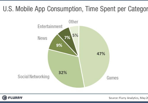 Flurry研究了不同應(yīng)用類(lèi)別占用時(shí)間。通過(guò)對(duì)2011年5月份超過(guò)8.5萬(wàn)個(gè)應(yīng)用數(shù)據(jù)的抓取,得到如圖數(shù)據(jù):