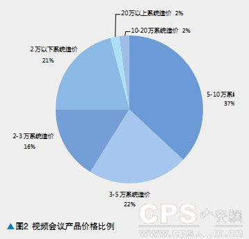 從產(chǎn)品價(jià)格上看,37%的視頻會(huì)議系統(tǒng)的每套價(jià)格在5-10萬(wàn)之間,22%的視頻會(huì)議系統(tǒng)的每套價(jià)格在3-5萬(wàn)元之間,另外,2-3萬(wàn)/每套以及1-2萬(wàn)/每套的視頻會(huì)議系統(tǒng)占據(jù)16%和21%。而價(jià)格在每套10萬(wàn)以上的高端視頻會(huì)議系統(tǒng)占比不到5%。
