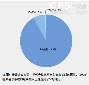從最大圖像分辨率來(lái)看,有39%以上的視頻會(huì)議系統(tǒng)采用1024×768分辨率,另外有24%的視頻會(huì)議系統(tǒng)采用1280×1024分辨率,而704×576分辨率的視頻會(huì)議系統(tǒng)占比為19%。更低分辨率的視頻會(huì)議系統(tǒng)的占比不到20%。這說(shuō)明向高清分辨率發(fā)展是視頻會(huì)議系統(tǒng)的主流。