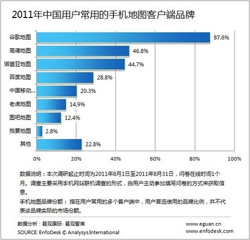 CTI論壇(ctiforum)11月25日消息(記者 潘婷婷): 據(jù)EnfoDesk易觀智庫最新發(fā)布的《2011中國手機(jī)地圖導(dǎo)航用戶調(diào)研報(bào)告》顯示,谷歌地圖、高德地圖及諾基亞地圖分別以87.6%、46.8%及44.7%的份額,占據(jù)2011年用戶最常用的手機(jī)地圖客戶端品牌份額(指在用戶常用的多個(gè)客戶端中,用戶首選使用的品牌比例,并不代表該品牌實(shí)際的市場份額,實(shí)際市場份額參見《2011年第3季度中國手機(jī)地圖客戶端市場監(jiān)測報(bào)告》)前三名的位置。