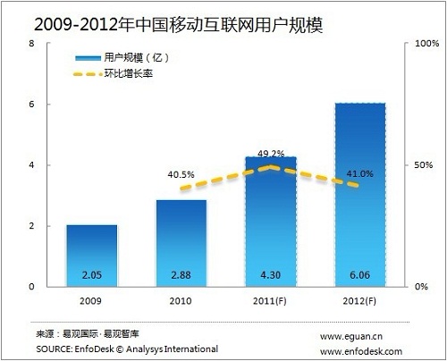 基于EnfoDesk易觀智庫(kù)對(duì)移動(dòng)互聯(lián)網(wǎng)的持續(xù)研究,預(yù)計(jì)2012年市場(chǎng)用戶規(guī)模及從移動(dòng)互聯(lián)網(wǎng)市場(chǎng)規(guī)模保持相對(duì)穩(wěn)定的增長(zhǎng),移動(dòng)互聯(lián)網(wǎng)用戶數(shù)有機(jī)會(huì)在2012年突破6億,并且超過互聯(lián)網(wǎng)用戶數(shù)量,智能終端、移動(dòng)互聯(lián)網(wǎng)應(yīng)用繼續(xù)延續(xù)2011年的增長(zhǎng)速度。
