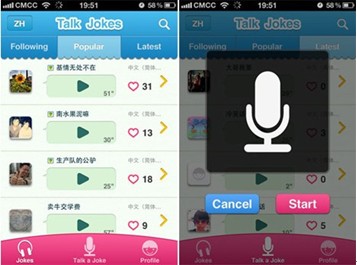 Talk Jokes是一款輕量級(jí)語音笑話分享應(yīng)用,鼓勵(lì)用戶通過真人錄音的方式上傳和分享自己的笑話,專注于“講笑話”的這部分語音垂直市場(chǎng)。