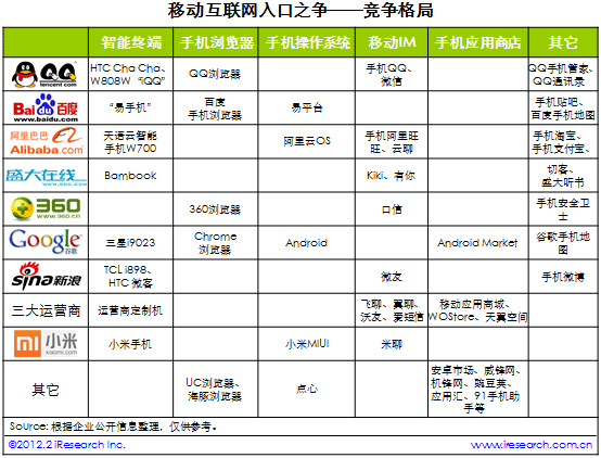 2012年,移動(dòng)互聯(lián)網(wǎng)“入口之爭(zhēng)”仍將繼續(xù),隨著移動(dòng)終端的普及,用戶數(shù)量和流量都將快速增長(zhǎng),各企業(yè)的核心策略仍以用戶數(shù)和流量為主,并在此基礎(chǔ)上開(kāi)始探索商業(yè)模式,并開(kāi)始布局整個(gè)生態(tài)系統(tǒng)。可以預(yù)見(jiàn),下一步的競(jìng)爭(zhēng)將蔓延到更具體的應(yīng)用類型上,但是互聯(lián)網(wǎng)企業(yè)的參與度不會(huì)像入口型應(yīng)用這么高,投資和兼并事件將有所增加。