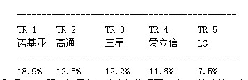 第一階段;湯森路透將每一項專利同歐洲電信標準協會截至2011年11月18日的LTE規(guī)范進行比較,確定專利的重要性。第二階段涉及先有技術檢查,即審查在美國和歐洲申請專利過程中的先有技術參考文獻。湯森路透利用先有技術參考文獻評估每項專利的新穎性并給出新穎性評級。湯森路透發(fā)現,擁有屬于LTE標準范疇的基本與新穎專利的領先廠商有諾基亞、高通、三星、愛立信和LG。結果如下: