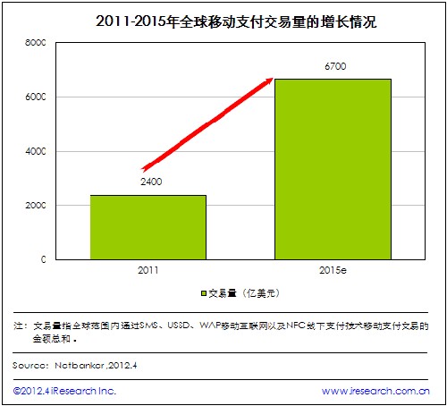 iResearch艾瑞咨詢整理Netbanker的最新數(shù)據(jù)發(fā)現(xiàn),2011年全球移動支付交易量達(dá)到2400億美元。該統(tǒng)計(jì)數(shù)據(jù)顯示,2015年全球移動支付交易量將達(dá)到6700億美元,使用手機(jī)銀行應(yīng)用程序的用戶數(shù)量較2010年將增加45%左右。另外,預(yù)計(jì)在未來18個月內(nèi)還會有20個國家增設(shè)NFC服務(wù)。