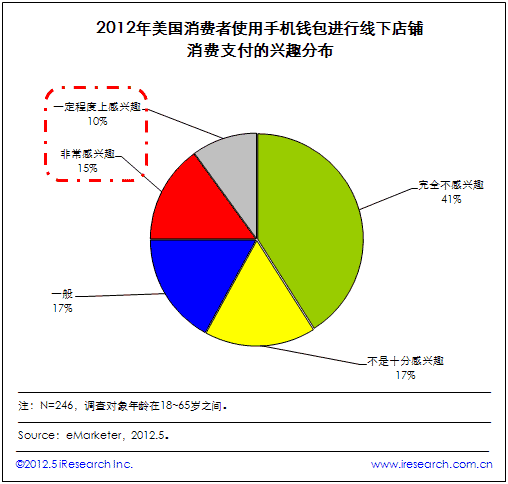 iResearch艾瑞咨詢整理eMarketer調(diào)查數(shù)據(jù)發(fā)現(xiàn),盡管手機支付市場增速迅猛,但其在美國消費者中的接受程度相對較低。數(shù)據(jù)顯示,被調(diào)查者中只有1/4的美國用戶對使用手機錢包在線下店鋪消費感興趣,而相比之下,58%的消費者對手機錢包技術(shù)不感興趣,其中包括41%的人完全沒興趣。