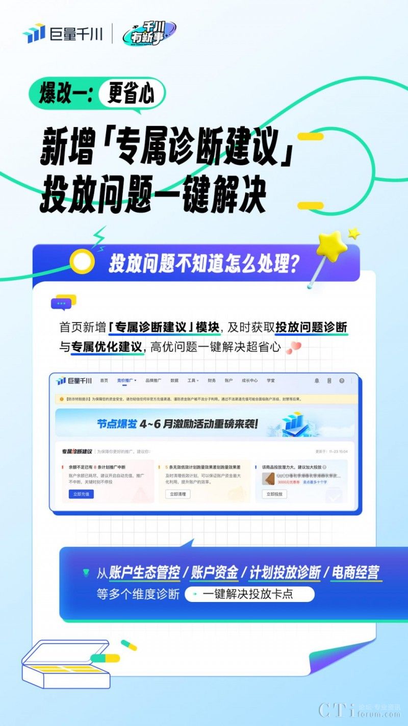 近期,為直面商家投放困境,全面提升投放效率,巨量千川PC端首頁全新推出四大重磅升級(jí)——上線「專屬診斷建議」、「數(shù)據(jù)看板」、「重磅產(chǎn)品推薦」和「平臺(tái)動(dòng)態(tài)」,助力商家更便捷、更從容地提升投放質(zhì)量和效果,高效推動(dòng)生意增長(zhǎng)!