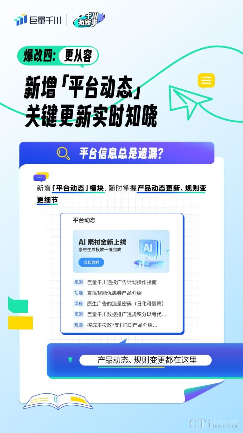 巨量千川首頁升級(jí)還增設(shè)了「平臺(tái)動(dòng)態(tài)」模塊,實(shí)時(shí)呈現(xiàn)平臺(tái)產(chǎn)品更新、規(guī)則變更等信息,讓商家可以及時(shí)了解平臺(tái)最新動(dòng)態(tài),把握生意增長(zhǎng)機(jī)遇。