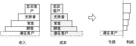 科特勒根據(jù)客戶的忠誠度給了我們一個(gè)階梯,這是客戶關(guān)系管理工作的良好參照,同時(shí)也可作為客戶關(guān)系管理工作考核的工具。我們將這個(gè)階梯做如下改造:每個(gè)層次的寬度是此級(jí)次客戶的數(shù)量,每個(gè)層次的高度是此級(jí)次客戶給企業(yè)帶來的收入,我們可以得到一個(gè)企業(yè)收入客戶分布結(jié)構(gòu)圖,如右圖所示: 從圖中可以很清楚的看出客戶管理工作的內(nèi)容:層次寬度(每個(gè)層次客戶的數(shù)量)和層次的高度(每個(gè)層次客戶的平均贏利水平)。 |