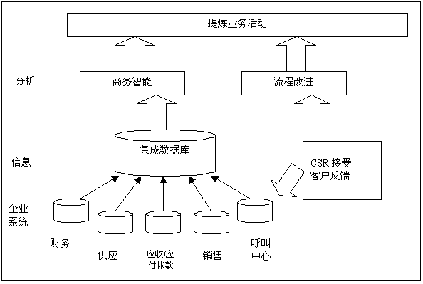 分析型CRM,也著稱(chēng)為“后臺(tái)”或“戰(zhàn)術(shù)”CRM。用來(lái)分析理解發(fā)生在前臺(tái)的客戶(hù)活動(dòng)。分析型CRM需要技術(shù)(編譯和處理大量的客戶(hù)數(shù)據(jù),以便于分析)和新的業(yè)務(wù)流程(提煉面向客戶(hù)的業(yè)務(wù),以提高忠誠(chéng)度和利潤(rùn)率)。在分析師和業(yè)界專(zhuān)家的推動(dòng)下,如今大多數(shù)CRM供應(yīng)商,或者創(chuàng)造分析型CRM能力,或者與商務(wù)智能(BI)供應(yīng)商合伙,合作分析他們的數(shù)據(jù)。圖2表明了數(shù)據(jù)和流程如何用來(lái)提煉業(yè)務(wù)活動(dòng)。