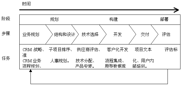 CRM規(guī)劃圖包括三個主要的項目開發(fā)階段:規(guī)劃、構(gòu)建、部署;它還以“分布驟”為特色,包括許多固定的和可變的任務(wù),簡單介紹如下: