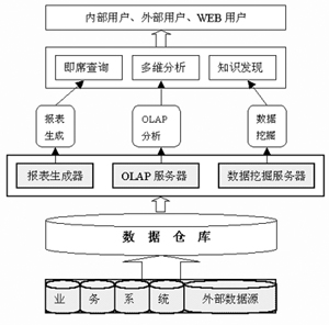 三個(gè)層次簡單明了,但在實(shí)際實(shí)施時(shí),卻需要應(yīng)用數(shù)據(jù)挖掘、人工智能、機(jī)器學(xué)習(xí)等多個(gè)領(lǐng)域的理論和技術(shù),以及統(tǒng)計(jì)學(xué)、決策科學(xué)、計(jì)算機(jī)科學(xué)等方面專業(yè)人才的密切合作,才能從數(shù)據(jù)倉庫的海量數(shù)據(jù)中淘出所需要的“金”;跀(shù)據(jù)倉庫的CRM體系結(jié)構(gòu)如圖所示。