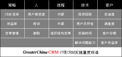 GreaterChinaCRM提出了一組量度標(biāo)準(zhǔn)(五個(gè)范圍共17項(xiàng)),不僅覆蓋了軟件/技術(shù)方面的回報(bào),也綜合包括了策略,人,流程,技術(shù)和客戶。這些量度標(biāo)準(zhǔn)告訴我們應(yīng)當(dāng)如何看待和評(píng)估CRM的實(shí)施。讓我們來看一下: