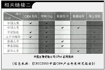 據(jù)某IT媒體2002年末的調(diào)研,只有不到1/5的中國保險(xiǎn)公司擁有客戶關(guān)系管理系統(tǒng),但是近六成的保險(xiǎn)公司計(jì)劃在近期內(nèi)實(shí)施CRM;另一份調(diào)查則顯示中國保險(xiǎn)業(yè)過去3年的IT投入平均達(dá)到9.36億元,幾乎所有的保險(xiǎn)公司都在從不同側(cè)面開展CRM建設(shè)。CRM在中國保險(xiǎn)業(yè)的應(yīng)用,到底是處于落伍還是冒進(jìn)狀態(tài),成為一個意味深長的話題。
