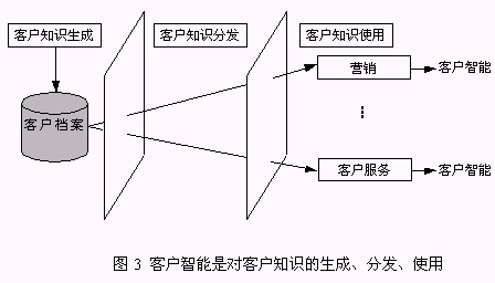 客戶知識(shí)是人們通過(guò)實(shí)踐認(rèn)識(shí)到的、與客戶有關(guān)的規(guī)律性,而客戶智能是獲得客戶知識(shí)并使用客戶知識(shí)求解問(wèn)題的能力。客戶智能是對(duì)企業(yè)戰(zhàn)略決策真正有價(jià)值的事物和行動(dòng)。客戶智能不僅包括了客戶知識(shí)的生成,而且更強(qiáng)調(diào)了客戶知識(shí)在企業(yè)中的分發(fā)、使用,直到產(chǎn)生客戶智能。所以,客戶智能是對(duì)客戶知識(shí)的生成、分發(fā)和使用(圖3)。