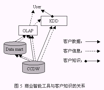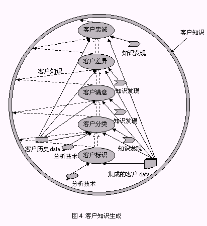 從以上構(gòu)成系統(tǒng)的三個(gè)組件的介紹中同時(shí)可以找到對(duì)以下兩個(gè)問(wèn)題的答案:1、客戶數(shù)據(jù)、客戶信息、客戶知識(shí)之間的區(qū)別(圖5):由來(lái)自于事務(wù)系統(tǒng),如ERP、SFA等的源數(shù)據(jù)經(jīng)整理后放入CCDW或數(shù)據(jù)集市,這一過(guò)程處理的對(duì)象稱(chēng)為客戶數(shù)據(jù);OLAP為決策人員提供了展示有意義的客戶數(shù)據(jù)的機(jī)制,這種有意義的客戶數(shù)據(jù)稱(chēng)之為客戶信息;客戶數(shù)據(jù)和客戶信息均可以通過(guò)KDD技術(shù)的運(yùn)用,提升為對(duì)決策有價(jià)值的客戶知識(shí)。2、客戶知識(shí)生成的途徑:從對(duì)第一個(gè)問(wèn)題的解答中可以知道,客戶知識(shí)從KDD作用的對(duì)象來(lái)看有兩種途徑:KDD作用于客戶數(shù)據(jù)、KDD作用于客戶信息,總之,客戶知識(shí)生成是依賴(lài)于KDD過(guò)程的復(fù)雜的過(guò)程。