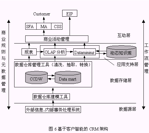 圖6是本文給出的以客戶智能為核心的I-CRM系統(tǒng)架構(gòu)。從數(shù)據(jù)源層來(lái)的客戶數(shù)據(jù)經(jīng)過(guò)ETL(抽取、轉(zhuǎn)換、裝載)、清洗后以數(shù)據(jù)存儲(chǔ)層的CCDW或數(shù)據(jù)集市的形式存儲(chǔ)。應(yīng)用支持層是提供了報(bào)表查詢、OLAP、知識(shí)發(fā)現(xiàn)分析決策工具,作用于客戶數(shù)據(jù),該過(guò)程產(chǎn)生的有價(jià)值的客戶知識(shí)存儲(chǔ)于動(dòng)態(tài)知識(shí)庫(kù)中;(dòng)層提供了I-CRM利用客戶知識(shí)從而有效實(shí)施其功能的場(chǎng)所。該架構(gòu)具有以下特點(diǎn):