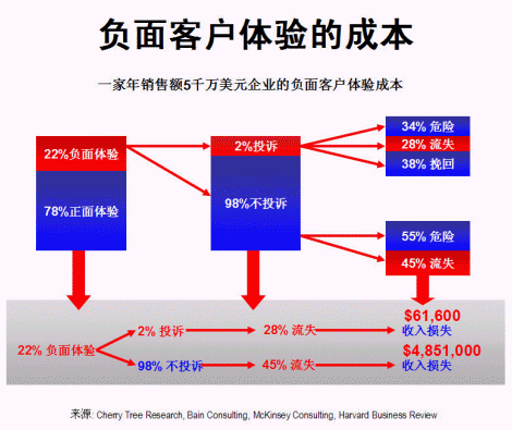 一家年銷售額五千萬美元的企業(yè),假設正面客戶體驗為78%,負面體驗為22%,在所有負面體驗中,只有2%的客戶投訴,其余98%大多數(shù)均不投訴,保持沉默(這與現(xiàn)實情況頗為吻合)。在2%投訴客戶中,有34%經(jīng)過處理仍然未能令客戶完全滿意,尚有流失的危險;28%的客戶在處理后依然流失,余下38%的客戶則感到滿意,繼續(xù)留下。對大部分(98%)沒有投訴的客戶,因公司對他們的不滿意并不知情,所以沒有采取行動,55%的客戶有隨時流失的危險,其余45%已經(jīng)流失。