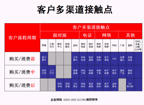 在零售時,消費前就是窗口演示;在消費中就是現(xiàn)場交易。訂單支付就在消費中的上門支付。而服務中心和現(xiàn)場服務這兩個接觸點則發(fā)生在消費后的現(xiàn)場咨詢與現(xiàn)場修理。而活動在購買前就是公開演示、購買中是銷售路演、購買后是VIP聚會。