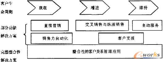 Kalakota and Robinson認(rèn)為,客戶關(guān)系管理主要包括了三個(gè)不同的階段,分別為獲。ˋcquisition)、增進(jìn)(Enhancement)與維持(Retention)。而這三個(gè)各異的部份,也正和客戶的不同生命周期階段不謀而合。