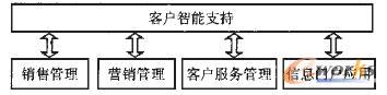 (5)客戶智能支持。客戶智能支持處于系統(tǒng)功能平臺(tái)的核心地位,若把圖2中的5個(gè)模塊比作是人體的不同功能器官,客戶智能支持就相當(dāng)于人的“大腦”。雖然CRM應(yīng)用系統(tǒng)中其他模塊也具各一定的數(shù)據(jù)統(tǒng)計(jì)分析能力,但它們的主要功能定位在業(yè)務(wù)操作和客戶協(xié)作層面,客戶智能支持模塊則是完整的、以輔助決策為設(shè)計(jì)目標(biāo)的分析型應(yīng)用,其基礎(chǔ)數(shù)據(jù)來(lái)自于各CRM業(yè)務(wù)流程運(yùn)行產(chǎn)生的大量數(shù)據(jù)及企業(yè)其他應(yīng)用系統(tǒng)數(shù)據(jù)。